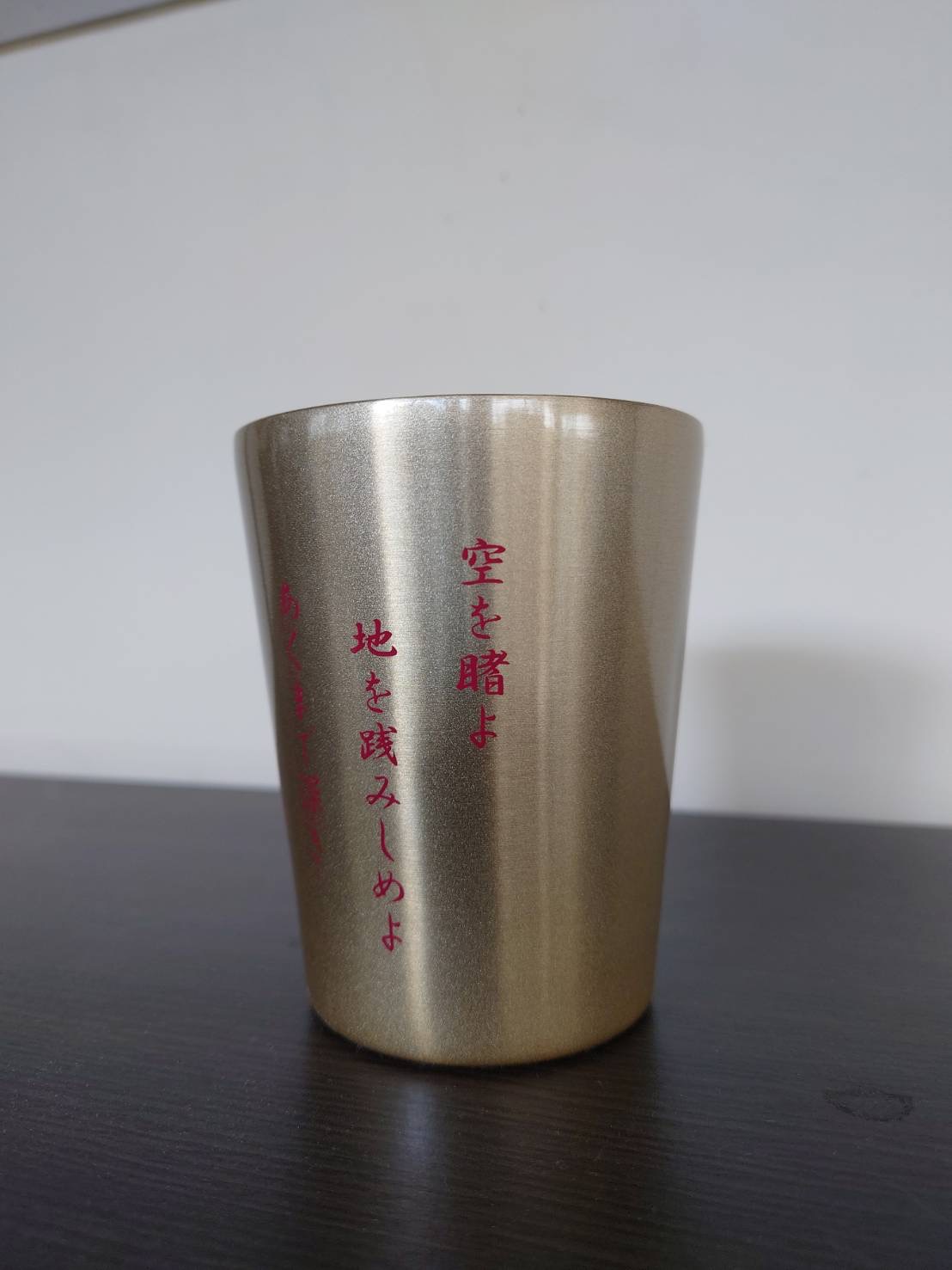 記念品は、校歌の歌詞が書かれた保温マグカップです。