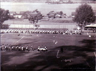 @@@ドラえもんの質問@@@ 【Q1】「蓖麻」は「ひあさ」と読むのですか? a.「蓖麻」は「ひま」と読みます。 あの戦争は石油を止めらたこともその一因と言われていて、戦争に使う油が足りず、蓖麻子油(ひまし油)を採るために「ひま」を校庭に植えた記憶があり、「ひましゆ」で変換したら出てきました。 【Q2】旧制中学と新制高校がよくわからないのですが、 近藤さんが韮山に通学していたのは何歳から何歳までですか? a. 旧制の学制は小学校6年、中学校5年、高等学校3年、大学4年でした。 中学校に行かない人が多く(試験に落ちて行けないのではなく)その人は小学校の高等科にもう2年間行った。 中学校から高等学校への入学試験は4年と5年の2回受験出来た。私も4年で試験に落ちてももう一年韮中5年をやって又高等学校が受験出来る筈であったが、韮中が無くなり韮高になってしまったので落ちれば新制韮高に行かざるを得なかったことになる。 だから最後のチャンスに運よく滑り込んだ訳です。 私は早生まれですので 韮中には満12歳から16歳までの4年間在学しました。 ![]() 写真の説明 昭和24年10月物資不足で何も無い時の運動会の入場行進を野球場から山上への階段を上り切った地点から撮影した1ショットです。珍しいのは校旗を支持して先等に歩いている生徒がひだスカートを着用していることです。当時女生徒は十人くらいしか在校して居なかったでしょう。会長席前を後続の生徒が歩いていますがトラックの内側を耕作し甘藷や蕪を植えました。ひまし草を植えたか記憶がありません。走り幅跳び用の砂場が見えますが野球の左翼手はこの辺で守らなければなりませんでした。フェンスの向こうは田圃で其の中の家並みは「蛭が小島」に行く道筋です。遥か向こううに見える韮山小学校まで全部稲作地で長岡から原木まで田方平野でした。 (写真提供&説明文=栗原一) この写真は、「朋友在韮山」の栗原さんに探していただきました。 「ひまし油」を作る「蓖麻」を植えるため校庭が開墾されたという近藤さんの話を興味深いと書いたところ、 『貴女はひまし草なんて知ってます? そう あれは回虫駆除のふるーい薬を採取する用途で栽培されていたのですが戦時中はヒコーキのエンジンに使用するグリスの代用品にするために強要された植物です。』と教えてくれました。 そして、2006/8/10。 ココに公開された写真とコメントを見た近藤さんは、こんなことを書いてくれました。 栗原君の写真のコメントの中に