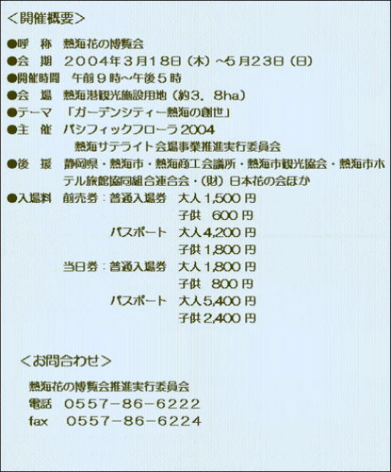 | 皆さん、こんにちは。私は高9回卒業の増井朋司です。 私は今年の3月から熱海市で開催される「熱海花の博覧会」の運営本部長をしております。 皆さんに是非この博覧会に興味を持っていただけたらと思っております。 これから数回のシリーズでこの博覧会を紹介させていただきたいと存じます。 <熱海ってどんなとこ?> 皆さんは熱海にいらっしゃったことはありますか。熱海は山と海に囲まれ、温暖な気候・温泉・・・と自然に恵まれています。また古くから文豪に愛された温泉地としても名高く、新婚旅行でいらした方や会社の宴席等でいらした方も多いのではないでしょうか。 <熱海花の博覧会って?> 熱海花の博覧会は今年の4月から始まる浜名湖花博のサテライト会場として、3月18日から5月23日までの67日間開催いたします。 <会場の特色は?> テーマガーデンの「恋人たちの庭」はギリシア神話の12星座をコンセプトとしたポケットパークです。 詳細につきましては、次号以降にご紹介させていただきたいと思います。 |