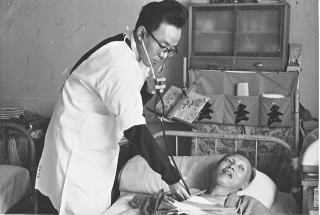 どのような手段で調達されたか存じませんが、本物の聴診器を首に下げて病室を巡回・往診を始めました。もちろん病棟婦長はご存知ありませんでしたがほとんど黙認の様子でした。有名な文筆賞を受けられた誇るべき名物患者さんでしたから無邪気の延長くらいの認識だったでしょう。遠藤先生も限界はよく承知されていて私も“栗ちゃん”の範囲内でお供していました。とても郊外の清瀬コロニーとの比較にはならない体験をさせていただいたわけです。
