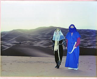 | 1992年晩秋。 地球上にさまざまな新年が有るだろうが、人生で初の舞台で初日の出を迎えるとしたらその一点Pは何処がユニークだろうか? 南極でペンギンと握手も良いだろうし、ヒマラヤのK2のピークでも凄いと思うけど、個人では不可能だろうから「もう少し確立の容易なポイントは?」と思考を巡らし、アジア、ヨーロッパ、南北アメリカ、オーストラリアとイメージを探って行き、アフリカ大陸なら何処と考えが至りました。 日中の国交が回復して第二の故郷に連続して里帰り出来たので、次はエキゾチックな地域を選びました。しかし最長の休暇は日曜から日曜までの8日間、出発と帰国を機中泊にしても10日が限度。このモロッコ行きも解雇を覚悟の行動に決定。 究極の目的は「サハラ砂漠での初日の出!」 先ずモロッコ政府観光局へ資料集めにGO。民族衣装の男女がCAMELの両側にポーズをとったポスターが飾られたオフィスに立ち、資料を請求。運よく笑顔の日本人女性が対応してくれて、当方の意向を理解し話が進みました。パリとアフリカ西海岸のダカールをゴールとするハードなラリーも知名度が上がってきた頃でしたので、タイミングも良かったのです。この女性が観光局の責任者だったのも幸いしてルートやノウハウのアドヴァイスも有り、サハラの旅が立ち上がりました。日程的にも無理な部分も幸運にカヴァーされたのです。 成田でエコノミーの搭乗券を受け取った際、しらけたムードを感じましたが毎度のことなので無視。Airフランスの747でパリに直行、スイス航空の小型機に乗り継ぎ、ジュネーヴ経由でモロッコ西海岸カサブランカに着陸、今迄にない雰囲気の入国審査に異国情緒がゾクッと感じられました。日本円がすんなり両替出来たのも、神がかりのようで不思議でした。チェックインした一泊目のホテルも絨毯やベッドカバーとかにアフリカ調が滲み、其の後の旅情に期待が膨らみました。食事で先ず気付いたのが、パン類の程度の上等な事。100年も以前からのフランスの影響が、こんな所にも現われていました。 人種的にも複雑さがあるのは当然で、テロ対策が観光客にも厳しい空気が流れるのを初日から体験しました。写真、ヴィデオの撮影で、ホテルの正面からスタートし、カメラをパンして街頭をなめてから通行する車を追ってフィルムを停めました。道路を渡ってホテルに戻りかけたところで呼び止められました。「今ヴィデオでポリスBoxを撮ったので、フィルムを巻き戻し、空を写すように」と命じ、「二重露光して前像を消去」の要求だったのです。 翌日はバスでアトラス山脈に向かい、有名なマラケシュに入りました。最初にスーク(市場)を探訪。必ず迷子になるのでガイドから眼を離さぬように注意あり。 「気をつけて!(バラク!)」ロバを避けた瞬間、腕を掴まれ狭い入り口に押し込まれる。ワイフと二人部屋の中央に拉致されてアッという間にショウのモデルになってしまう。2〜3分でドレスアップ!他のグループからも拍手。そのまま脱がずにスークに出ると、現地人にまた腕を取られ地下の工房に導かれました。「このベルベル族の衣裳なら帯剣するのが正装」と、アリババ式短剣を装着、ワイフは蜜蝋の首飾りで本式になりました。 旅を愉しむ準備が揃ったので夕方から狂気の広場と呼ばれるジャマ・エル・フナ広場の催事を見物、なんとも不思議な雰囲気に圧倒されました。全部仕掛け無しのパフォーマンスを、これでもかと投げつけられたのです。柱に括りつけただけのロープを不安定に張り、相棒の頭を踏み台に飛び乗り、素足のまま絶妙なバランスで走るように渡りきると見料を集金するタイミングの良さ、人間の塔を築きあげ何の苦も無く飛び降りる鳥のような身軽さ、取り巻くオープンスカイの軽食店、口から炎を吐いて焼き上げる魔法の焼肉シシカバブ。其の後ファンタジア宮殿の騎馬ショウも、銃声とともに忘れ難い宵でした。 カサブランカなどの都会から離れた地方のモロッコ族の一般的な衣裳は、周辺の山並みによく眼にする断層と同じ色彩の茶、灰色、こげ茶、濃オレンヂの縞模様で、ベルベル族のブルー一色と区別されます。代表的な料理は、頂点に穴の開いた円錐形の蓋つき土鍋で羊肉、野菜を煮たタジン、モロッコ風混ぜ焼き飯クスクスで、猫が出迎えるレストランで度々供されました。猫のいる店は美味と説明がありました。 翌朝リコンファームを済ませた後、峻険なアトラス山脈の峠越えを体験しました。凍結した上、ガードレールも不備なドライブウェイを、バスは強引に登って行きます。300mはあろう谷底に バスの落下車輌が点々と認められため息が出ます。尾根近く残雪に囲まれたアイド・ベン・ハドウのレストランで極上のミントテイの素晴らしさに思わず驚きの声が出ました。生の葉を十枚ほど入れたコップに熱い砂糖湯を注いだシンプルなサービス!香りと甘さと味の絶妙な調合 セシボン。 満足を思いながら少し歩き、川原の岩石