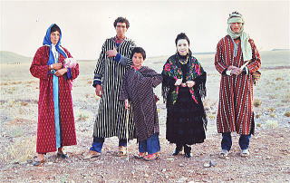![]() モロッコ族特有の縞模様をまとった遊牧民と ・・・駱駝は前を歩いています・・・ |
