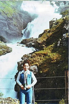2時間後、フィヨルドの谷のやや平地部分の桟橋で下船し、登山電車に乗り換え、今度は光る水面を眼下に、尖った山々の肩の部分を右へ左へと登って行きました。車掌がカメラ・チャンスをプレゼントするため、次のコーナを回った地点で3分停車すると告げてきました。連結部で扉を開けた時凄い音とともに、階段型の瀑水の前に停まりました。