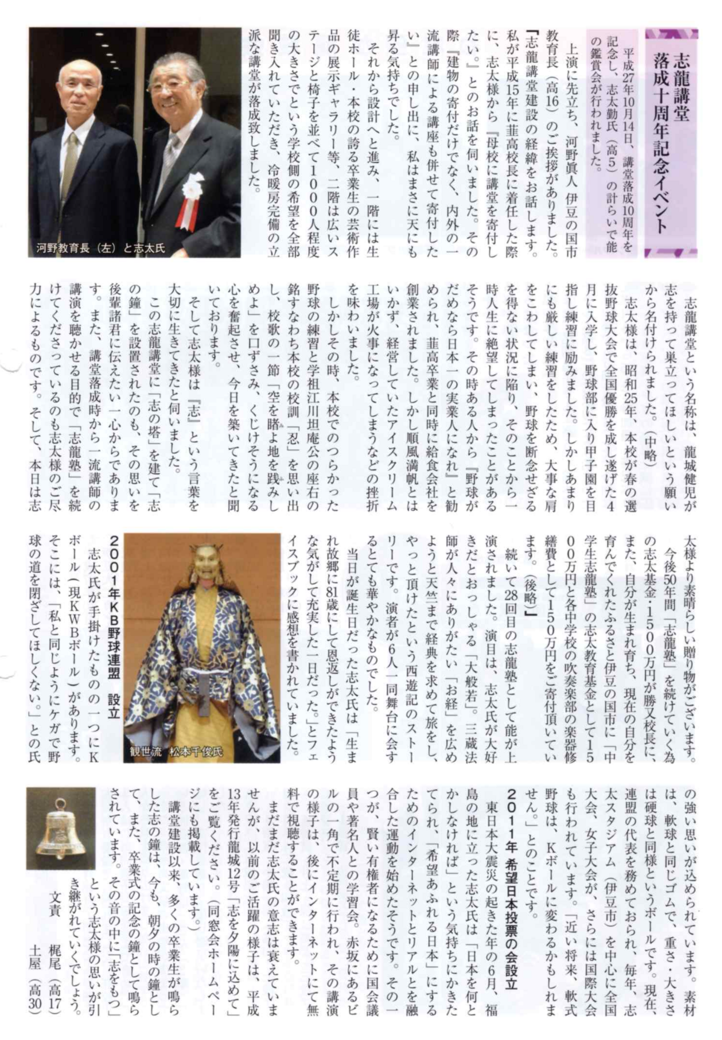 修善寺の別荘を訪れたときには母校に立ち寄ってくださり、志龍講堂が生徒たちに幅広く利用されていることを大変喜んでくださいました。 なお、志太さんは「志龍講堂」のいわゆるハード的なご寄付だけでなく、この講堂で生徒に一流の講師の話を聞かせたいと願い『志龍塾』と名付けた講演会が毎年開催できるように手配してくださいました。