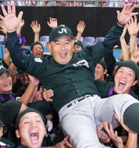 富士重工業(太田市 1-0)、ヤマハ(浜松市 5-2)、準々決勝 三菱重工広島(広島市 4-0)、 準決勝 兄弟対決JR東日本東北(仙台 6-3)、そして堀井さんが選手、マネージャーを務めた三菱自動車川崎時代の監督垣野多鶴氏率いるNTT東日本(東京都 )との師弟対決を 2×-1と制しての 初優勝本当におめでとうございます。 たくさんの皆様の応援本当にありがとうございます。 東日本大震災に配慮し、2つの大会が中止となり、都市対抗野球も8月から10月に延期され、 会場も東京ドームから大阪京セラドームへと変更になりました。 そのような特別な年に優勝できた要因は何だと思われますか? 被災地を中心にまだまだ、震災の影響が大きく残る中で、 82回を迎える都市対抗が開催される意義 をチーム一同考えて参りました。 私なりに出した答えは、「チーム一丸となったひたむきなプレーで、 応援して頂く皆様にお応えする 」事でした。 激戦の東京都予選3試合と、京セラドームのハイレベルな決勝までの5試合に至るまで、 全ての場面で 、一球無二の精神で戦った結果だと思います。 スポーツチャンネルで応援させて頂きましたが、本当にすばらしい対戦でした。 TVに映る堀井監督のお顔は、とても凛々しくまさに勝負師という感じでしたが、 監督としてのご苦労される点、また楽 しさはどんなところですか? 我がチームは、コーチやトレーナー等チームスタッフ7名と選手29名の所帯です。 まずメンバー一人一人が公私共充実した日々を送り成長し、 その結果ゲームで100%の力を発揮出来 る事。 次にメンバー間が互いに信頼しあいチーム力を最高に高めていける組織である事。 以上に心を砕いています。 監督としての苦労も喜びも全て上記の心を砕く過程と、また結果の中にあります。 西武にドラフト一位指名された十亀投手や縞田内野手、川端外野手の三選手がスカウトされるなど、高いレベルのチームとは言え、ベスト16以降4日連続で戦わなければならないわけですから、強いだけでは優勝はできませんね。 ヤマハ戦で負傷し、ベンチでバックアップした斉藤主将の力もあったかもしれませんね。 今回の優勝をはじめ準優勝2回と監督としてはすばらしい結果を出されていますが、 選手生活は決して恵まれてはいなかったようにも思うのですが、、 韮高でレギュラーかどうかの選手が、六大学でホームランを打ち、都市対抗でタイムリーヒットを 打ったわけですから、選手としての自分には今でも満足しています。 まあ、他の社会人チームの監督さん方の現役時代の実績は、私とは比較にならないくらいもの凄いも のがありますから、指導者として人二倍三倍努力しなければとは心がけてます。 そして1年勝負の社会人で選手・指導者として28年間ユニフォームを着させて頂いてますので、大変 有り難く「感謝」の気持ちでいっぱいです。 慶応大学時代に六大学で打ったホームランは、日本製紙石巻の木村泰雄監督(高32)の所属していた立教大学からだそうですね。都市対抗で、代打タイムリーを打って日本生命戦の試合を決めたことは、垣野監督もよく覚えているとTVで紹介されてました。 恵まれていないなんて大変失礼いたしました。堀井監督の代の韮高野球部は、17人と当時としては珍しく人数が多かった年でしたね。そのいわば不完全燃焼が慶応大学でも野球を続けようと思われた理由ですか? 単に野球が好きで、全力を尽くして野球をやりたかっただけです。 レギュラーになれるとは、正直思いませんでした。 とにかく、グランドには誰よりも長くいて、練習中は一番声を出し、移動は全て全力疾走。これを徹底しました。 そしたら、野球が(特に打撃)少しずつうまくなり、神がかり的にチャンスをことごとくものにしてったのです。 丁度、今回の優勝のように。 堀井監督の生きる姿勢みたいなものが伝わってきました。 韮高の入学式が終わってすぐに「今から部活に出ていいですか?」と訊いたエピソードもお聞きしましたよ。 そんな生徒だったかもしれません。野球に限らず、高校・大学と学生時代は好きならば続ける事は 出来ますから。 逆に言うと、社会人野球はそれだけ厳しいということですね。 最後に同窓生へのメッセージをお願い致します。 私の原点は韮山高校です。尊敬する恩師と刺激を受ける仲間に恵まれ、最高の環境で学んだ3年間 、そして卒業してからの同窓生との絆は私の一生の財産です。 これからも韮山高校のご発展と同窓生のご活躍を心からお祈り申し上げます。 お忙しい中、本当にありがとうございました。堀井さんの方こそ同窓生の誇りです。JR東日本の合宿に参加させて頂いた韮高野球部の選手たちも、今回の優勝をとても喜んでいました。ぜひ続いて欲しいですね。 では、今後もますますご活躍下さい。 その韮高野球部、11月12日(土)台湾の選抜チームと親善試合を行うそうです。 VS 穀保家商 試合開始 10:::00〜 @裾野球場 東部、中部、西部のベスト4が台湾の強豪校と対戦するそうです。 修学旅